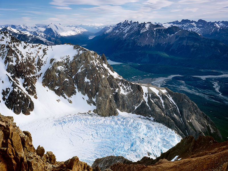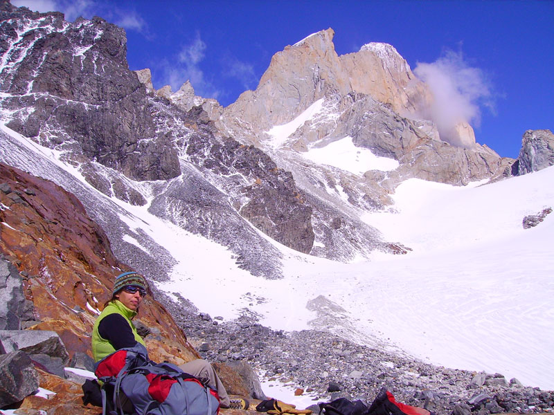 This is a strategic viewpoint to see the west face of Fitz Roy and the Patagonian Ice Field. After an early ride to rio Eléctrico (16 km) we start walking on an easy trail for two hours to reach the Piedra de Fraile campsite. The trail up to this point is flat and protected from the weather. The serious climb starts here. It will take four hours to reach the Paso del Cuadrado at 1500 mts from 600 mts on a very steep trail and screes. From the Piedra Negra Bivouac (where mountaineers sleep before attempting the spires) to the pass, the last 45 minutes, we’ll have to rope up and put on crampons to traverse a small glacier. Just a few meters before the top we will have to use our hands just to gain more confidence and scramble a bit. Once at the Pass we’ll have one of the best panoramic mountain landscapes that you can imagine: the west faces of Auguilles Guillaumet, Mermoz, Pollone, Mount Fitz Roy and Cerro Torre. To the north the hidden Volcano Lautaro and the Patagonian Ice Field. We’ll return the same way back to the road and then by vehicle to El Chaltén.