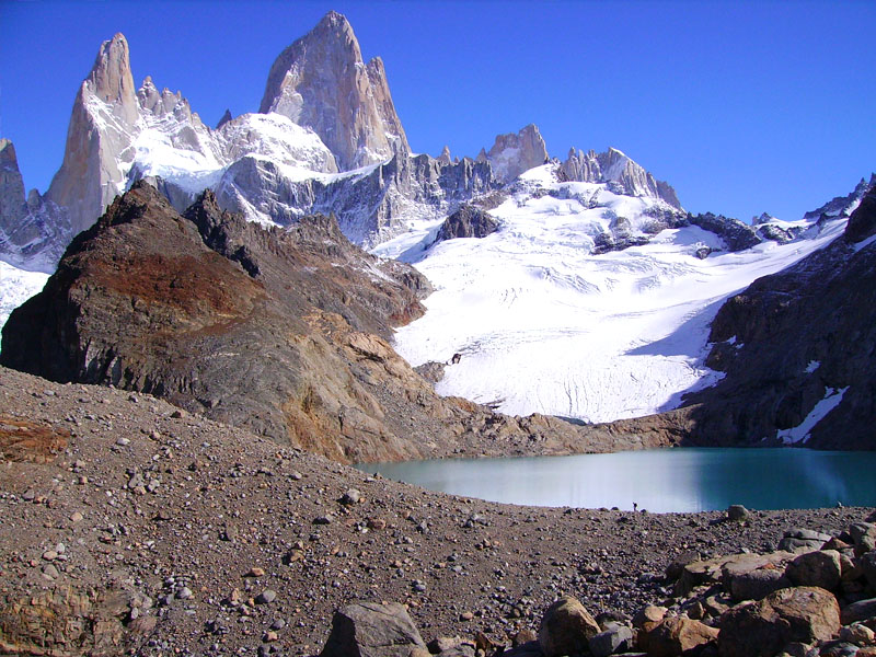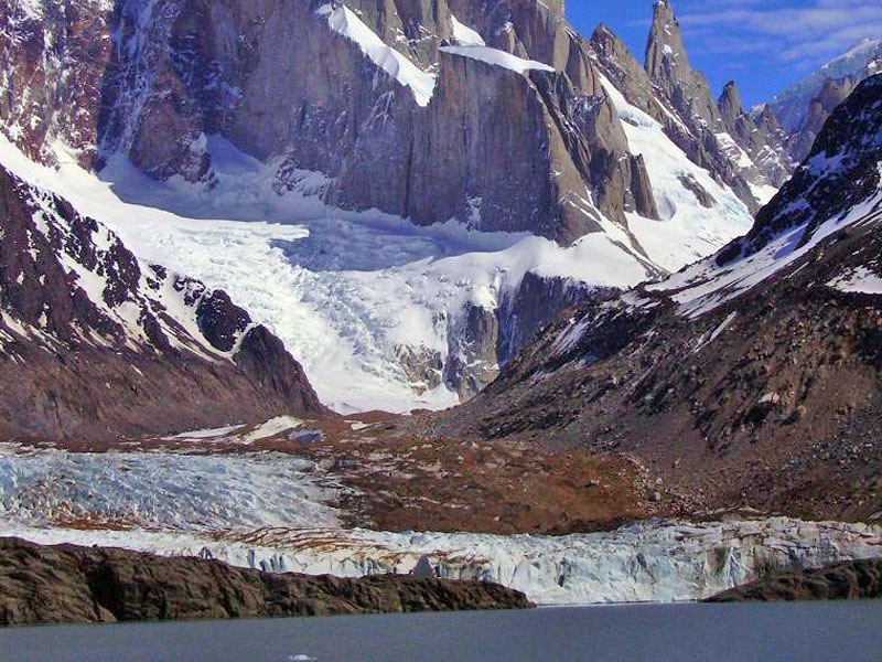 Beautiful day hike to get to the closest lookout to see the legendary Cerro Torre, one of the wildest mountains on earth! It takes three hours to get to this glacial lake at the end of the Torre Glacier. On the way we’ll have a break at the Mirador del Torre (Torre Lookout) to see the typical glacial valley of the Fitz Roy River and a good panoramic of the mountains. From this point we’ll go down for a short while and then the hike is going to be relatively flat except a few small hills of glacial origin called moraines that cross the valley. Before reaching the lake we’ll pass by the De Agostini basecamp, named after a famous Italian mountaineer and geographer. From this camp to the lake there are ten minutes through a kind of strangely wasted landscape: the debris hills of the last glacial advance’s moraines. Once at the lake, a place that can be extremely windy, we’ll see the amazing Cerro Torre Group and hear about the fascinating stories of the first climbers from our guide. To the left or south you’ll see Cerro Solo and to the north Cerro Techado Negro: the geology of these mountains is very interesting. To complete this beautiful scenery there’s the Torre Glacier and the snowcapped Adela’s Range. Estimated time: 7 to 8 hs. Aprox. Distance: 20 km.